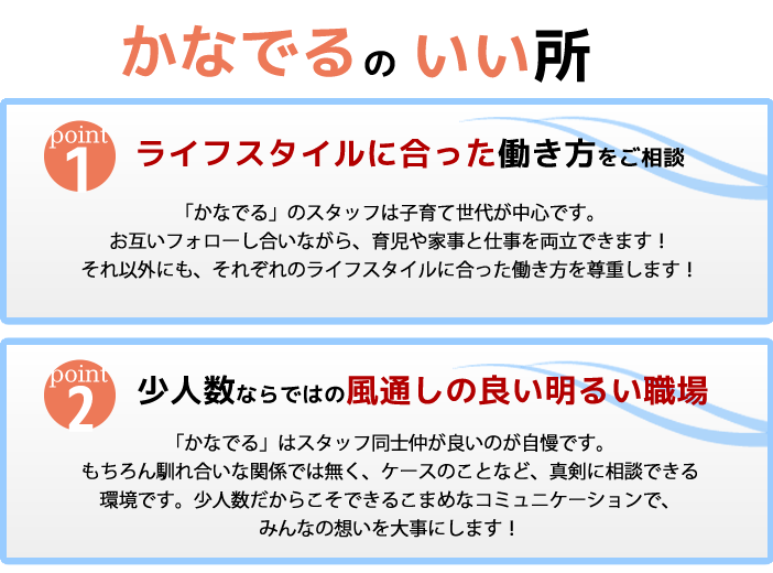 | 各種待遇 | 社会保険( 健康保険・厚生年金・雇用保険・労災保険 )完備 交通費支給 必要な物品はすべてこちらで用意します。 パートの方は、法人の業績、本人の勤務成績等勘案し正社員への登用あり。 |